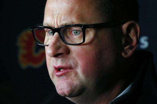 Calgary Flames General Manager Brad Treliving addresses the media following an NHL hockey practice Tuesday, Nov. 26, 2019, in Buffalo, N.Y. Treliving says Flames coach Bill Peters remains on the staff but wasn't certain whether he'd be behind the bench for the next game. The team and the NHL are both investigating an allegation the Peters directed racial slurs at a player 10 years ago when the two were in the minors. Akim Aliu, a Nigerian-born player, says Peters 'œdropped the N bomb several times' in a dressing room during his rookie year.(AP Photo/Jeffrey T. Barnes) The Associated Press