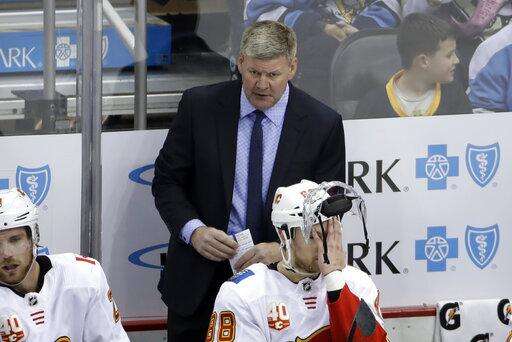 Calgary Flames head coach Bill Peters stands behind Andrew Mangiapane (88) during the third period of an NHL hockey game against the Pittsburgh Penguins in Pittsburgh, Monday, Nov. 25, 2019. The Penguins won in overtime 3-2. (AP Photo/Gene J. Puskar) The Associated Press