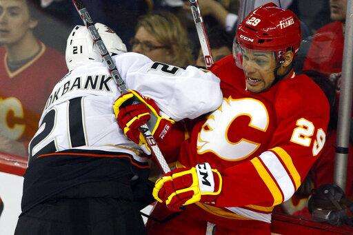 FILE - In this April 7, 2012, file photo, Anaheim Ducks' Sheldon Brookbank, left, checks Calgary Flames' Akim Aliu, a Nigerian-born Canadian, during third period NHL hockey action in Calgary, Alberta. Calgary Flames general manager Brad Treliving said the team is looking into an accusation that head coach Bill Peters directed racial slurs toward a Nigerian-born hockey player a decade ago in the minor leagues, then arranged for the player's demotion when he complained. Akim Aliu tweeted Monday, Nov. 25, 2019, that Peters 'œdropped the N bomb several times towards me in the dressing room in my rookie year because he didn't like my choice of music.' (AP Photo/The Canadian Press, Jeff McIntosh, File) The Associated Press
