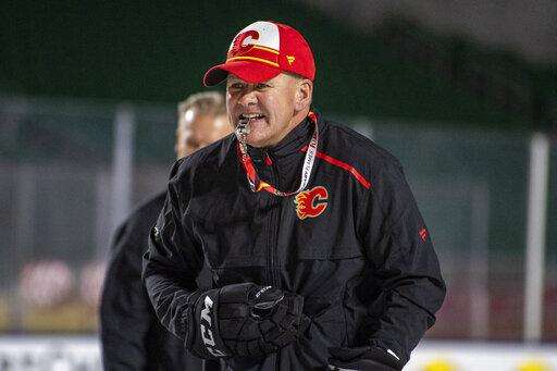 FILE - In this Oct. 25, 2019, file photo, Calgary Flames coach Bill Peters watches practice in Regina, Saskatchewan, ahead of the NHL Heritage Classic outdoor hockey game against the Winnipeg Jets. Calgary Flames general manager Brad Treliving said the team is looking into an accusation that head coach Bill Peters directed racial slurs toward a Nigerian-born hockey player a decade ago in the minor leagues, then arranged for the player's demotion when he complained. Akim Aliu tweeted Monday, Nov. 25, 2019, that Peters 'œdropped the N bomb several times towards me in the dressing room in my rookie year because he didn't like my choice of music.' (Liam Richards/The Canadian Press via AP, File) The Associated Press