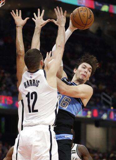 Cleveland Cavaliers' Cedi Osman (16) passes against Brooklyn Nets' Joe Harris (12) in the second half of an NBA basketball game, Monday, Nov. 25, 2019, in Cleveland. The Nets won 108-106. (AP Photo/Tony Dejak) The Associated Press