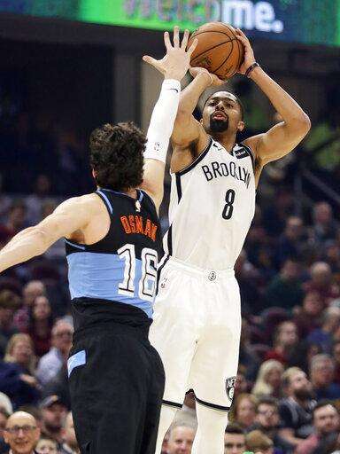 Brooklyn Nets' Spencer Dinwiddie (8) shoots over Cleveland Cavaliers' Cedi Osman (16) in the first half of an NBA basketball game, Monday, Nov. 25, 2019, in Cleveland. The Nets won 108-106. (AP Photo/Tony Dejak) The Associated Press