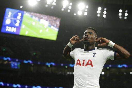 Tottenham's Serge Aurier celebrates his goal goal during the Champions League Group B soccer match between Tottenham Hotspur and Olympiakos at the Tottenham Hotspur Stadium in London, Tuesday, Nov. 26, 2019. (AP Photo/Matt Dunham) The Associated Press