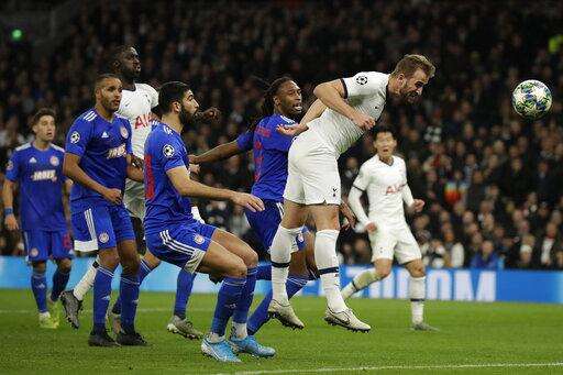 Tottenham's Harry Kane scores his side fourth goal during the Champions League Group B soccer match between Tottenham Hotspur and Olympiakos at the Tottenham Hotspur Stadium in London, Tuesday, Nov. 26, 2019. (AP Photo/Matt Dunham) The Associated Press