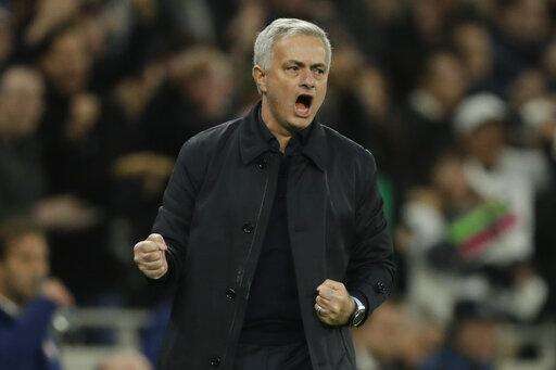 Tottenham's manager Jose Mourinho celebrates his team second goal during the Champions League Group B soccer match between Tottenham Hotspur and Olympiakos at the Tottenham Hotspur Stadium in London, Tuesday, Nov. 26, 2019. (AP Photo/Matt Dunham) The Associated Press