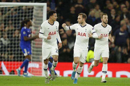 Tottenham's Dele Alli, left, celebrates his goal with Tottenham's Christian Eriksen during the Champions League Group B soccer match between Tottenham Hotspur and Olympiakos at the Tottenham Hotspur Stadium in London, Tuesday, Nov. 26, 2019. (AP Photo/Matt Dunham) The Associated Press