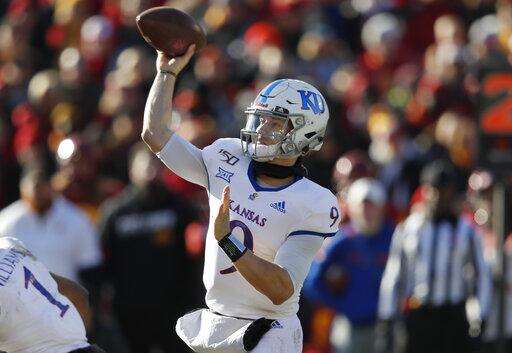 Kansas quarterback Carter Stanley passes the ball during the second half of an NCAA college football game against Iowa State, Saturday, Nov. 23, 2019, in Ames, Iowa. Iowa State won 41-31. (AP Photo/Matthew Putney) The Associated Press