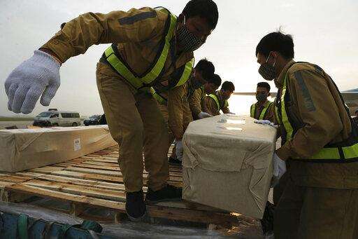 Airport personnel carry a coffin on the tarmac of the Noi Bai airport on Wednesday, Nov. 27, 2019 in Hanoi, Vietnam. Media reports in Vietnam say the bodies of 16 of the 39 Vietnamese who died when human traffickers carried them by truck to England last month have been repatriated to their homeland. (Vietnam News Agency via AP)