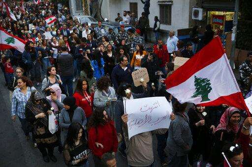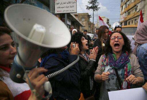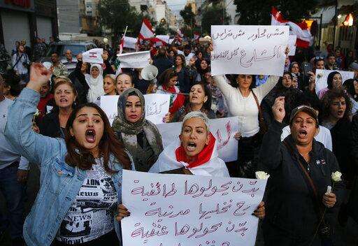 Lebanese women shout slogans during a protest against the return of the civil war, in Beirut, Lebanon, Wednesday, Nov. 27, 2019. Hundreds of Lebanese women marched across a former front line in the Lebanese capital carrying white roses and Lebanese flags to denounce overnight clashes between rival groups that injured dozens of people. (AP Photo/Hussein Malla) The Associated Press