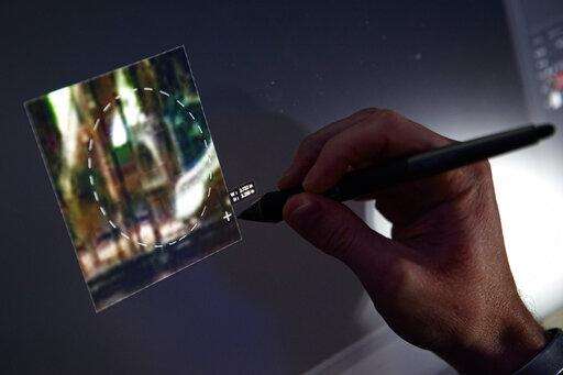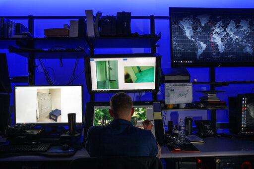 Inside, new technology meets old: Fluorescent office lights are turned down and specialized blue lights glow. Giant, state-of-the-art computers with high-definition screens are set up alongside old police sketches of faces.