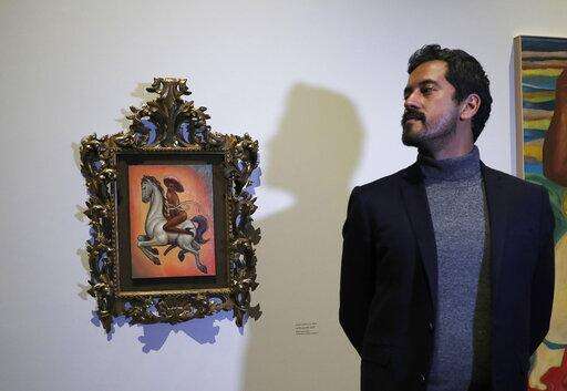 Mexican artist Fabian Chairez stands next to his painting showing Mexican Revolution hero Emiliano Zapata straddling on a horse nude, wearing high heels and a pink, broad-brimmed, during an interview at the Fine Arts Palace in Mexico City, Wednesday, Dec. 11, 2019. Mexico President Andres Manuel Lopez Obrador says he'll ask his culture minister to mediate a dispute over an effeminate painting of Zapata. (AP Photo/Marco Ugarte)