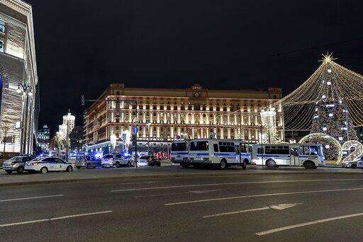 Police buses and cars block the area near the building of the Federal Security Service (FSB, Soviet KGB successor), right, in the background in Moscow, Russia, Thursday, Dec. 19, 2019. Russia's main security agency says shots have been fired near its headquarters in downtown Moscow. (AP Photo/Mikhail Kirakosyan) The Associated Press