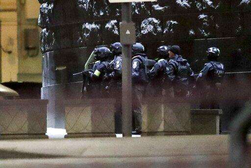 Russian special forces secure the area at the building of the Federal Security Service (FSB, Soviet KGB successor) in the background in Moscow, Russia, Thursday, Dec. 19, 2019. Russia's main security agency says shots have been fired near its headquarters in downtown Moscow. (AP Photo/Pavel Golovkin) The Associated Press