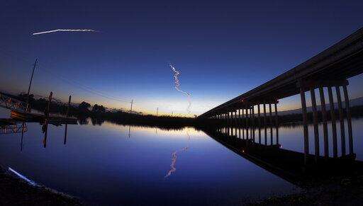 A United Launch Alliance Atlas V rocket streaks across the horizon at dawn in this view from the St. Johns River, east of Sanford, Fla., Friday, Dec. 20, 2019. The rocket was carrying Boeing's Starliner crew capsule toward the International Space Station on an unpiloted test flight and was visible along the U.S. east coast. (Joe Burbank/Orlando Sentinel via AP) The Associated Press
