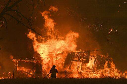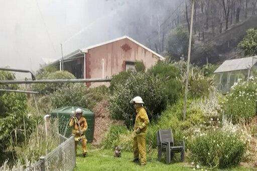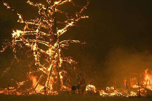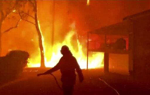 In this image made from video taken and provided by NSW RFS via their twitter account, a firefighter sprays water on a fire moving closer to a home in Blackheath, New South Wales state, Australia Sunday, Dec. 22, 2019. Prime Minister Scott Morrison on Sunday apologized for taking a family vacation in Hawaii as deadly bushfires raged across several states, destroying homes and claiming the lives of two volunteer firefighters.(Twitter@NSWRFS via AP)