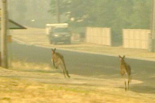 In this image made from video taken Dec. 21, 2019, kangaroos move as nearby property burn in a fire in Lithgow, New South Wales state, Australia. Australian Prime Minister Scott Morrison on Sunday apologized for taking a family vacation in Hawaii as deadly bushfires raged across several states, destroying homes and claiming the lives of two volunteer firefighters.(Australian Broadcasting Corporation via AP)