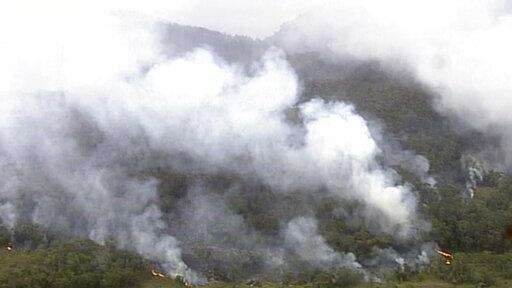 In this image made from video, fire and smoke rise from a bushfire at Blue Mountains, New South Wales state, Australia Sunday, Dec. 22, 2019.Australian Prime Minister Scott Morrison on Sunday apologized for taking a family vacation in Hawaii as deadly bushfires raged across several states, destroying homes and claiming the lives of two volunteer firefighters.(Australian Broadcasting Corporation via AP)