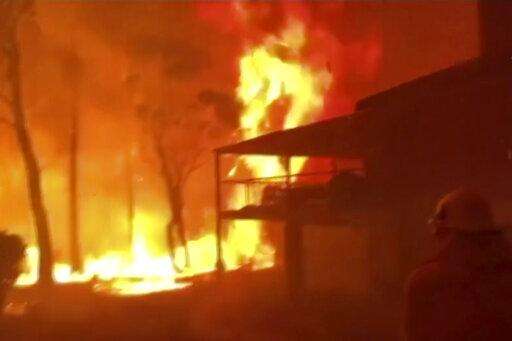 In this Saturday, Dec. 21 ,2019, photo, NSW Rural Fire Service crews fight the Gospers Mountain Fire as it impacts a structure at Bilpin. Australian Prime Minister Scott Morrison on Sunday, Dec. 22, apologized for taking a family vacation in Hawaii as deadly bushfires raged across several states, destroying homes and claiming the lives of two volunteer firefighters.(Dan Himbrechts/AAP Images via AP)