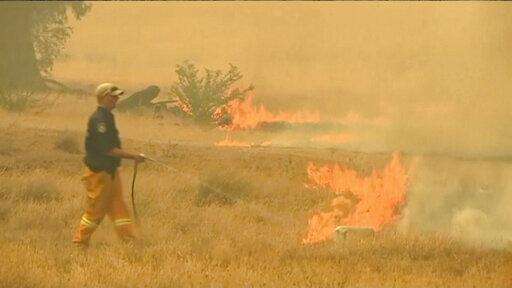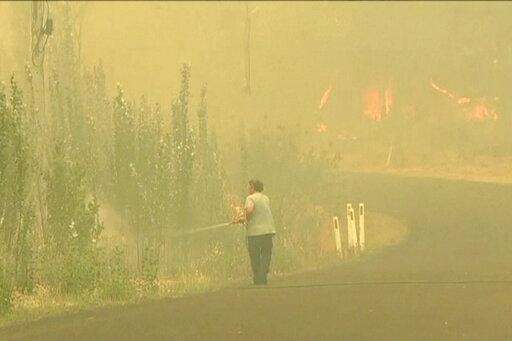 In this image made from video taken Dec. 21, 2019, a man sprays water on a fire in Lithgow, New South Wales state, Australia. Australian Prime Minister Scott Morrison on Sunday apologized for taking a family vacation in Hawaii as deadly bushfires raged across several states, destroying homes and claiming the lives of two volunteer firefighters.(Australian Broadcasting Corporation via AP)