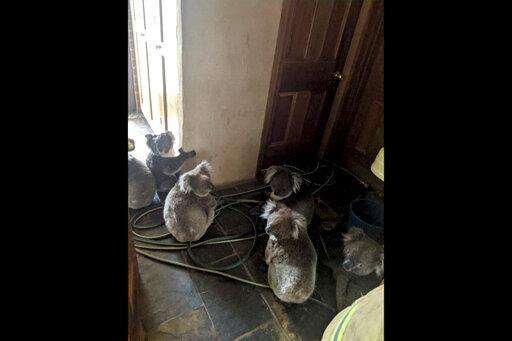In this Dec. 20, 2019, photo taken and provided by Adam Mudge, koalas sit inside a home in Cudlee Creek, South Australia, after being rescued from fires at a garden. Local firefighters assigned to protect a property from an approaching fire in South Australia on Friday helped a homeowner move koalas into her house to keep them safe from the flames. (Adam Mudge via AP)