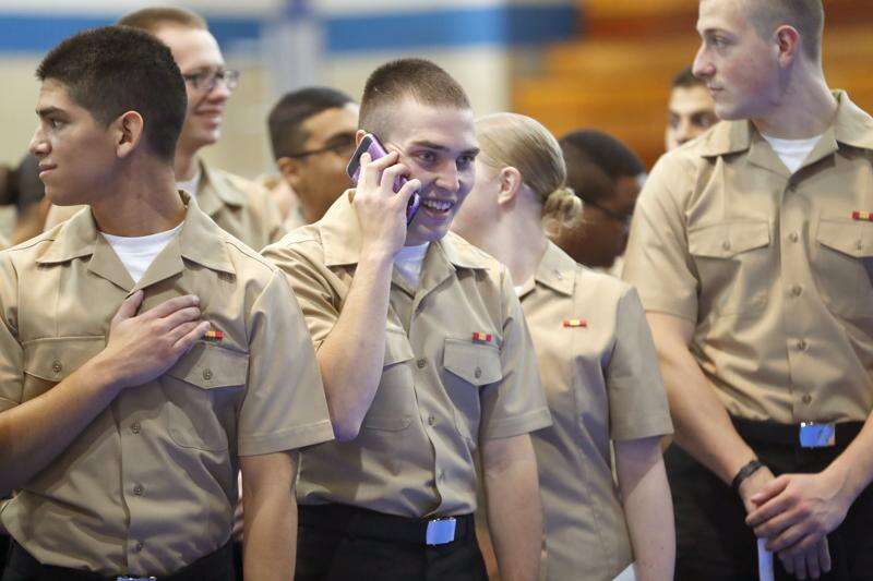The recruits settled into chairs at the center of the gym to wait for the ceremony to start, and Dee Dreyer of McHenry passed her cellphone to anyone who wished to call home.