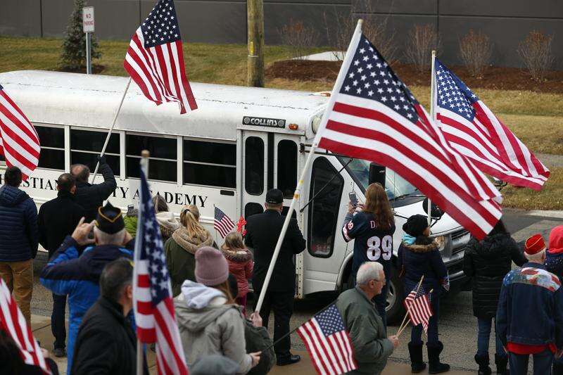 Christian Liberty Academy greets 35 sailors from Naval Station Great Lakes Wednesday with a police and motorcycle escort and a parade of flags. Brian Hill/bhill@dailyherald.com
