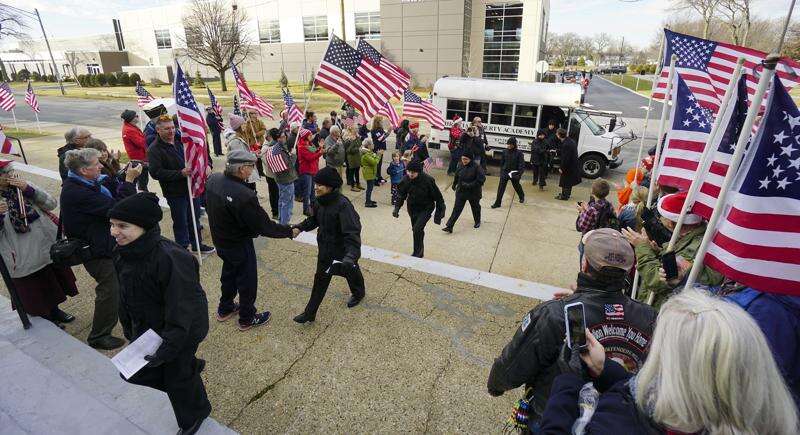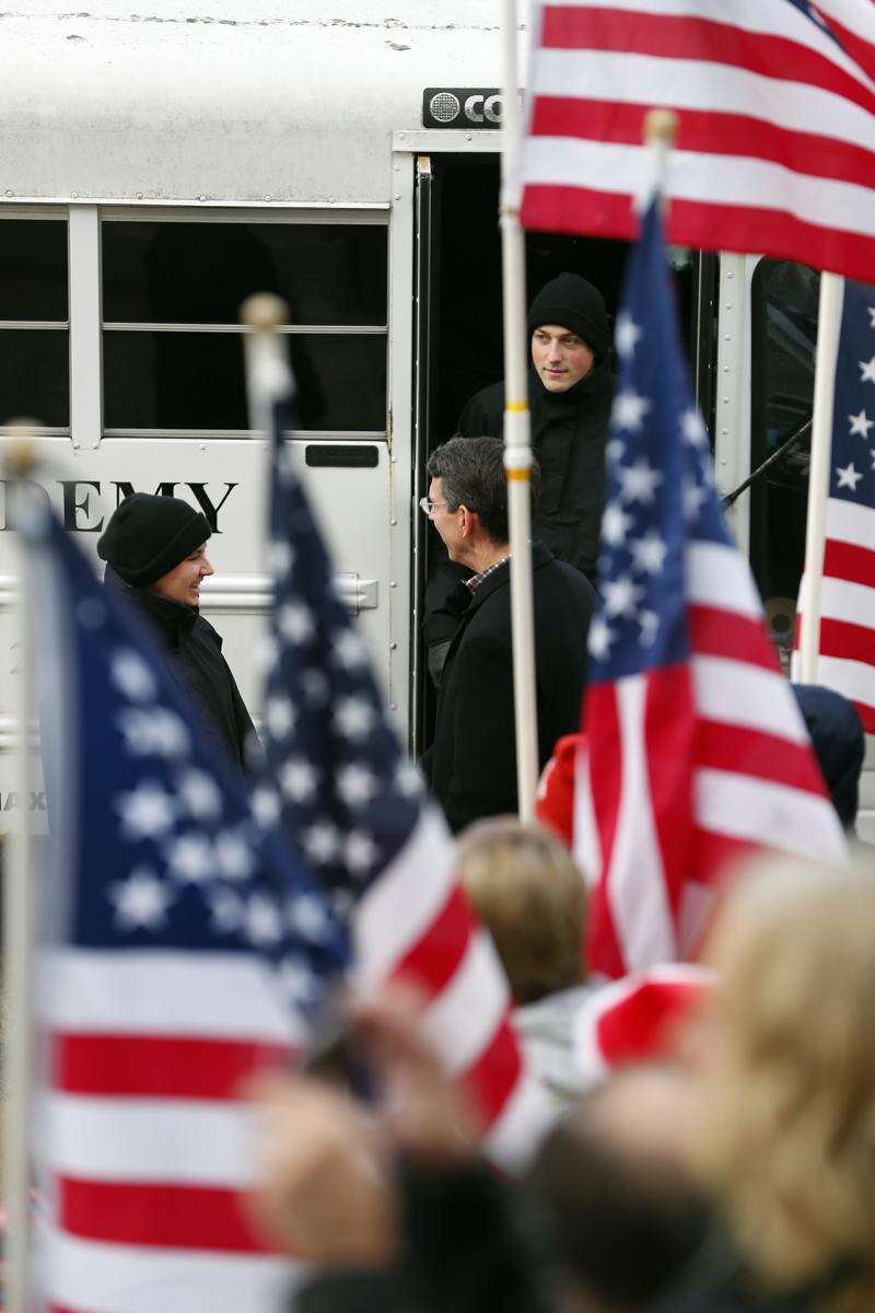 Spectators hoisting American flags line the street in front of the academy's gym entrance, as well as the steps leading to the doors.