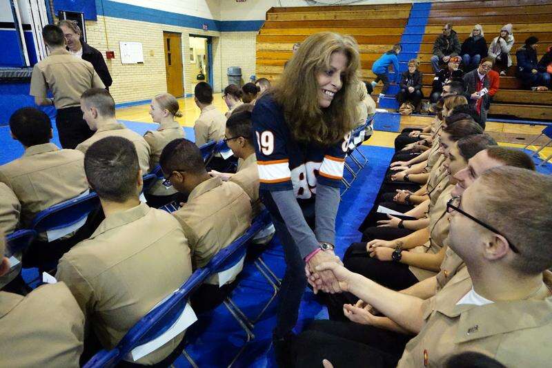 Arlington Heights Mayor Tom Hayes greets sailors from Naval Station Great Lakes as they arrive at Christian Liberty Academy. Brian Hill/bhill@dailyherald.com