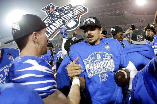 Memphis quarterback Brady White, center, celebrates after his team defeated Cincinnati in an NCAA college football game for the American Athletic Conference championship Saturday, Dec. 7, 2019, in Memphis, Tenn. (AP Photo/Mark Humphrey) The Associated Press