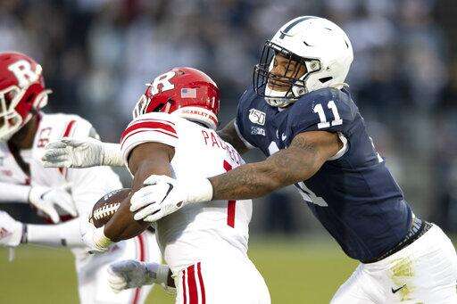 FILE - In this Nov. 30, 2019, file photo, Penn State linebacker Micah Parsons (11) tackles Rutgers tight end Johnathan Lewis (11) in the first quarter of an NCAA college football game, in State College, Pa. Parsons was selected to The Associated Press All-America team, Monday, Dec. 16, 2019. (AP Photo/Barry Reeger) The Associated Press