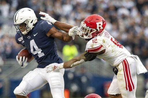 Penn State running back Journey Brown (4) stiff arms Rutgers defensive back Christian Izien (12) in the first quarter of an NCAA college football game in State College, Pa., on Saturday, Nov. 30, 2019. (AP Photo/Barry Reeger) The Associated Press