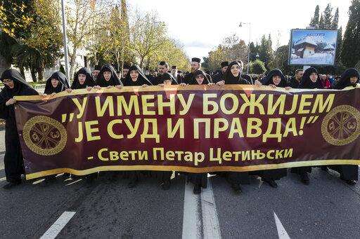 Serbian Orthodox Church clergy in Montenegro march and hold a banner reading: ''Judgment and Justice are in God's name'' as they protest the planned adoption of a religious law that they say will pave the way to strip the church of its property, in Podgorica, Montenegro, Tuesday, Dec. 24, 2019. Montenegro's pro-Western president has accused the church of promoting pro-Serb policies in Montenegro and seeking to undermine the country's statehood since it split from Serbia in 2006. (AP Photo/Risto Bozovic) The Associated Press