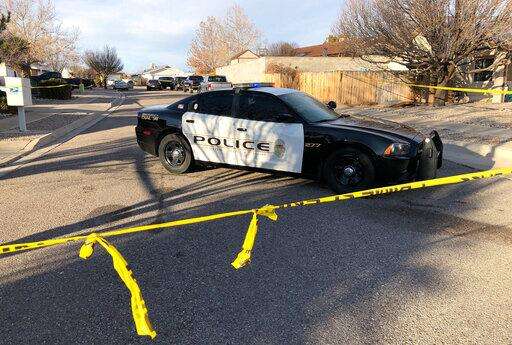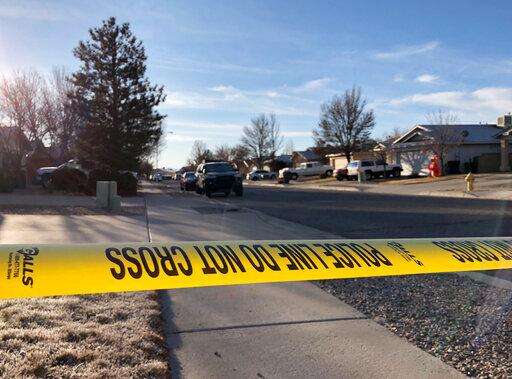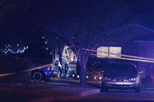 Crime scene tape ropes off an area where multiple people were found dead in a home in the Northern Meadows subdivision, Wednesday, Dec. 25, 2019, in Rio Rancho, N.M. (Roberto E. Rosales/The Albuquerque Journal via AP)