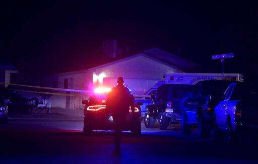 An officer works at the scene where multiple people were found dead in a home in the Northern Meadows subdivision, Wednesday, Dec. 25, 2019, in Rio Rancho, N.M. (Roberto E. Rosales/The Albuquerque Journal via AP)