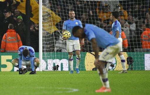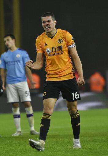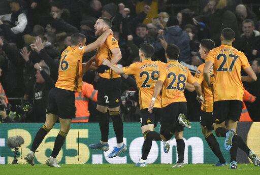 WOLVERHAMPTON, England (AP) - Matt Doherty scored in the 90th minute to complete Wolverhampton's comeback from two goals down to beat 10-man Manchester City 3-2 on Friday, dealing a further blow to the champions' faint hopes of a third consecutive Premier League title.