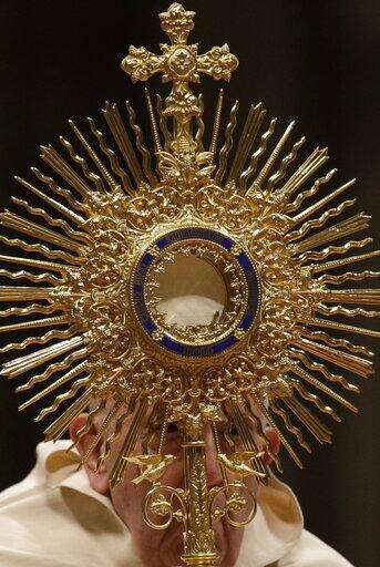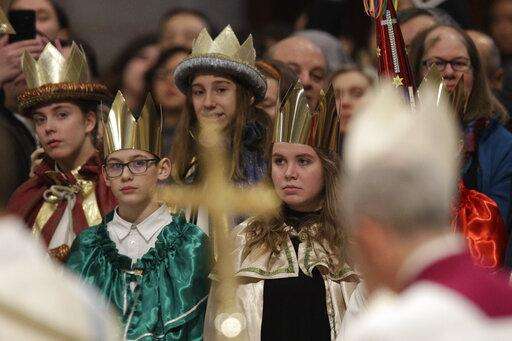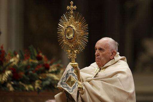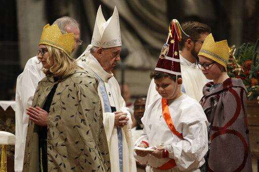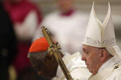 Pope Francis presides over a Mass for the solemnity of St. Mary at the beginning of the new year, in St. Peter's Basilica at the Vatican, Wednesday, Jan. 1, 2020. (AP Photo/Gregorio Borgia)