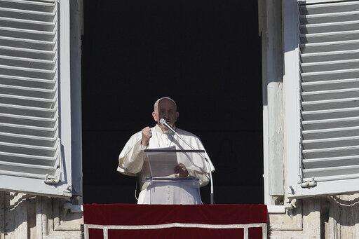 Pope Francis recites the Angelus prayer from his studio's window overlooking St. Peter's square at the Vatican, Wednesday, Jan. 1, 2020. (AP Photo/Gregorio Borgia)