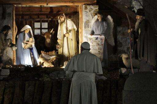 Pope Francis stops by the Nativity exposed in St. Peter's square after presiding over vespers of the Feast of St. Mary and Te Deum of Thanksgiving at year's end, in St. Peter's Basilica at the Vatican, Tuesday, Dec. 31, 2019. (AP Photo/Gregorio Borgia)