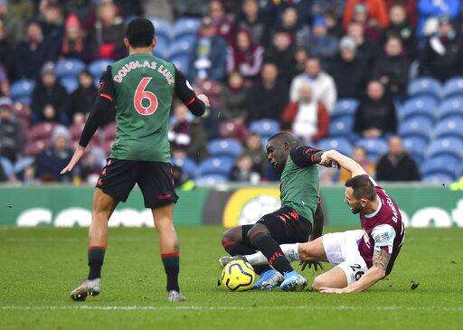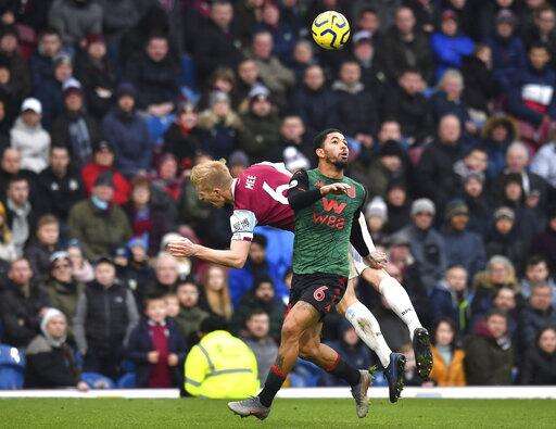 Burnley's Ben Mee, background and Aston Villa's Douglas Luiz battle for the ball, during the English Premier League soccer match between Burnley and Aston Villa, at Turf Moor, Burnley, England, Wednesday Jan. 1, 2020. (Anthony Devlin/PA via AP) The Associated Press