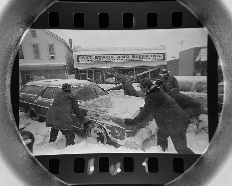 The Daily Herald Archive, Assignment # 49,356, Dom Najolia photo: Firefighters try to move a vehicle stuck in the snow in order to move equipment in to help with the roof collapse at the Sit, Stack and Sleep Shop in Arlington Heights in January of 1979.