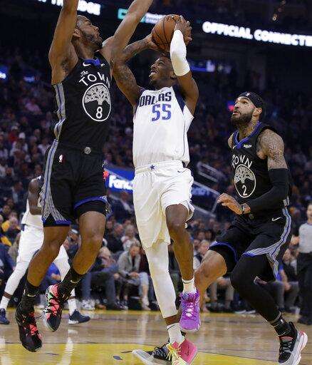 Dallas Mavericks' Delon Wright, center, shoots between Golden State Warriors' Alec Burks, left, and Willie Cauley-Stein (2) in the first half of an NBA basketball game Tuesday, Jan. 14, 2020, in San Francisco. (AP Photo/Ben Margot) The Associated Press