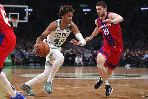 Boston Celtics guard Romeo Langford (45) drives to the basket as Detroit Pistons guard Sviatoslav Mykhailiuk (19) defends during the first half of an NBA basketball game in Boston, Wednesday, Jan. 15, 2020. (AP Photo/Charles Krupa) The Associated Press