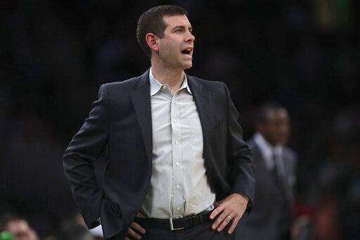 Boston Celtics coach Brad Stevens calls to his players during the first half of an NBA basketball game against the Detroit Pistons in Boston, Wednesday, Jan. 15, 2020. (AP Photo/Charles Krupa) The Associated Press