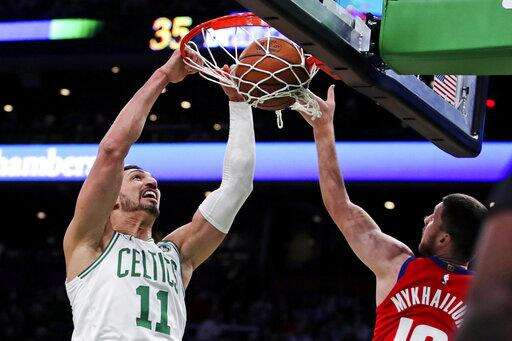 Boston Celtics center Enes Kanter (11) dunks next to Detroit Pistons guard Sviatoslav Mykhailiuk (19) during the first half of an NBA basketball game in Boston, Wednesday, Jan. 15, 2020. (AP Photo/Charles Krupa) The Associated Press