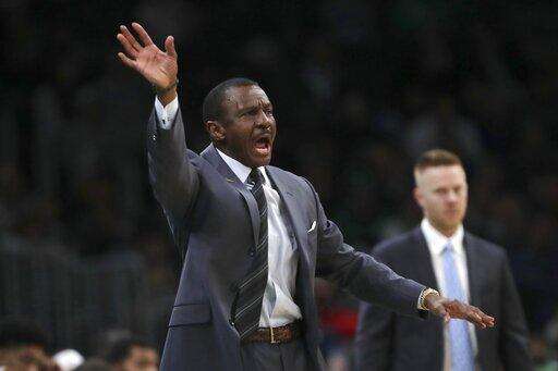 Detroit Pistons head coach Dwane Casey calls to his players during the first half of an NBA basketball game against the Boston Celtics in Boston, Wednesday, Jan. 15, 2020. (AP Photo/Charles Krupa) The Associated Press