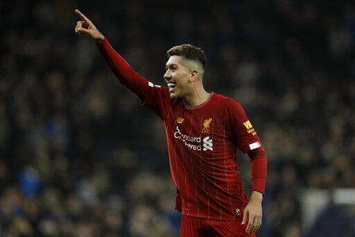 Liverpool's Roberto Firmino celebrates at the end of the English Premier League soccer match between Tottenham Hotspur and Liverpool at the Tottenham Hotspur Stadium in London, England, Saturday, Jan. 11, 2020. Liverpool won 1-0. (AP Photo/Matt Dunham) The Associated Press