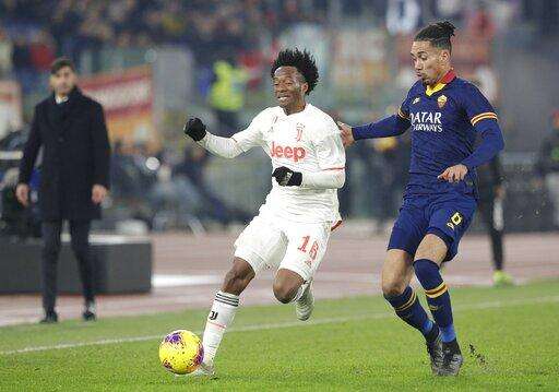 Juventus' Juan Cuadrado, centre, and Roma's Chris Smalling challenge for the ball during the Serie A soccer match between Roma and Juventus at the Rome Olympic Stadium, Italy, Sunday, Jan. 12, 2020. (AP Photo/Andrew Medichini) The Associated Press