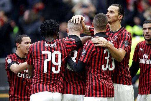 AC Milan's Ante Rebic, center, celebrates with his teammates after scoring his side's third goal during a Serie A soccer match between AC Milan and Udinese, at the San Siro stadium in Milan, Italy, Sunday, Jan. 19, 2020. (AP Photo/Luca Bruno) The Associated Press