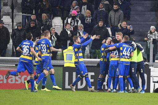 Parma's Andreas Cornelius celebrates with teammates after scoring against Juventus during an Italian Serie A Soccer match at the Allianz Stadium in Torino, Italy, Sunday, Jan. 19, 2020. (Fabio Ferrari/LaPresse via AP) The Associated Press