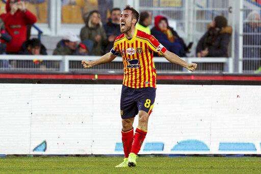Lecce's Marco Mancosu celebrates after he scored his side's first goal during a Serie A soccer match between Lecce and Inter Milan, in Lecce, Italy, Sunday, Jan. 19, 2020. (Donato Fasano/LaPresse via AP) The Associated Press